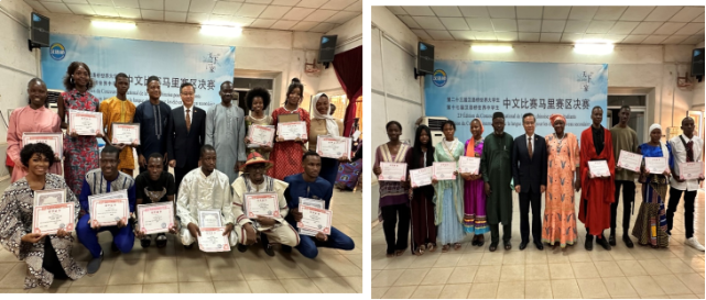 经过激烈角逐,来自孔子学院汉语专业的Oumou Diakité同学获大学生组冠军,劳特达姆女子中学的Houm Koulssoum KONE同学获中学生组冠军,他们将代表马里赛区参加在中国举行的2024年“汉语桥”世界大中学生中文比赛总决赛,大学生组的亚军同学将随行参加观摩。