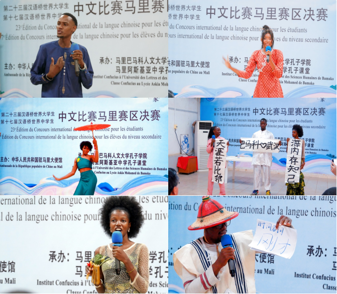 来自孔子学院的6位大学生和孔子课堂的4位中学生经过层层选拔,分别参加第23届“汉语桥”世界大学生暨第17届“汉语桥”世界中学生中文比赛马里赛区决赛。在主题演讲环节,同学们紧扣“天下一家”和“追梦中文、不负韶华”的主题,从汉语缘、中国梦、求学路、爱和平等多个角度,进行热情洋溢的演讲,表达对中文的喜爱。在中华才艺展示环节,同学们表演脱口秀、快板相声贯口、诗歌朗诵、中文歌、中国民族舞、书法等才艺,现场气氛热烈。